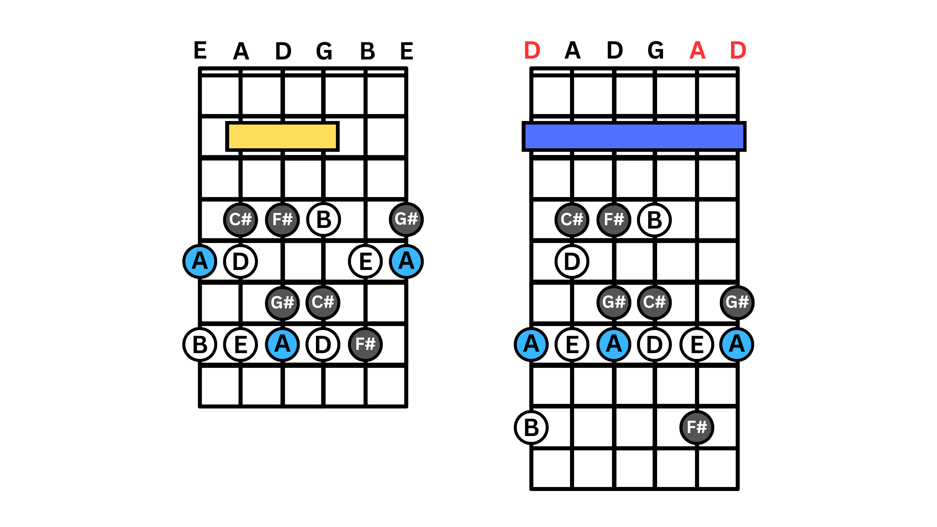 As I mentioned, you don’t have to re-learn everything in a new tuning. Some strings, if they remain in their original pitches, can allow for some of the same figures we know, like three-string chord voicings or melodic fragments.